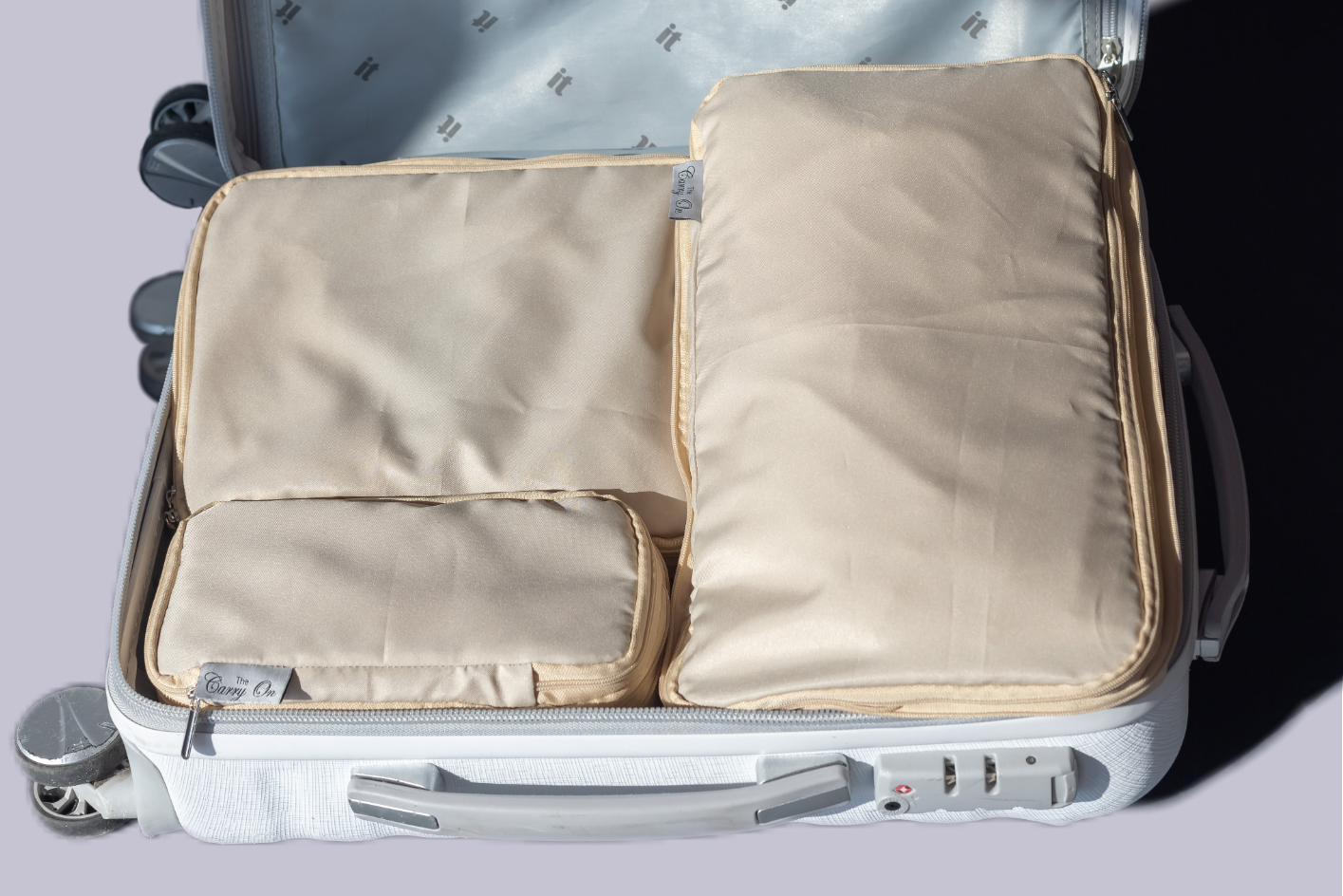Кубчетата стягат багажа, спестяват място и държат всичко подредено. Заедно трите размера перфектно пасват в куфарче за ръчен багаж.
